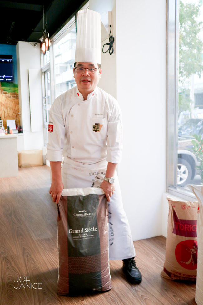 店內也展示著許燕斌手作烘焙所使用的麵粉原料,堅持用法國最高頂級克朗思克麵粉、法國競賽用T55麵粉還有僑泰興麵粉混粉製作,即使價格上會比一般麵粉貴上好幾倍,老師仍堅持使用最高品質;並且以台灣食材為基底,堅持使用台灣在地農產品。