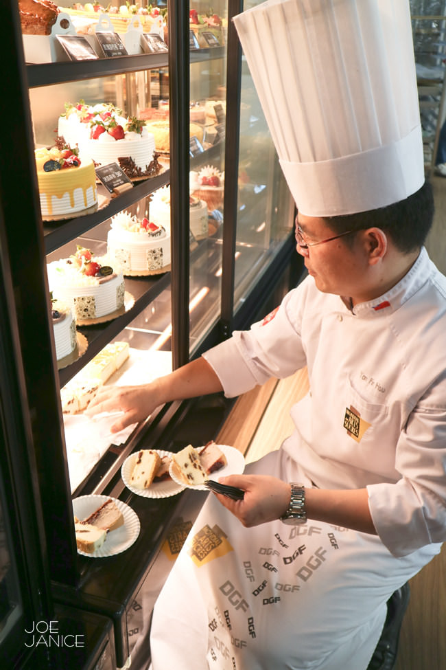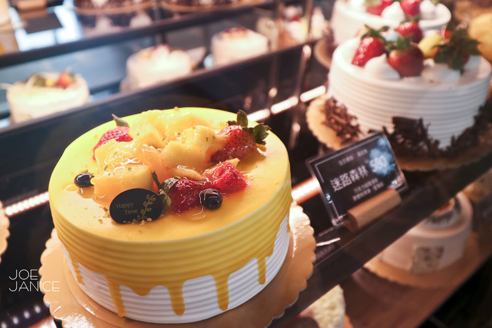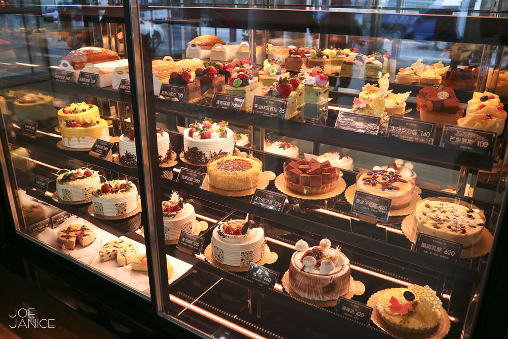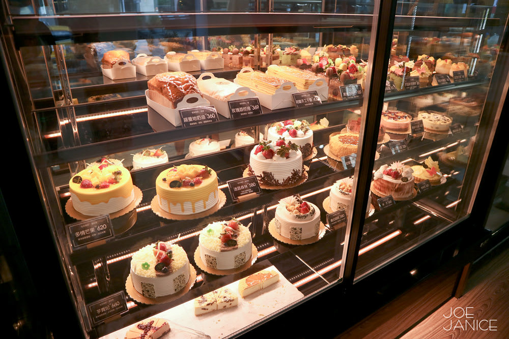 蛋糕甜點櫃裡,是各式漂亮且顏色鮮豔蛋糕甜點,每一款皆是老師們的精心之作