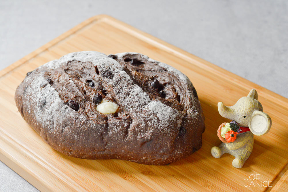 麵團中使用了頂級巧克力,鬆軟中吃的到巧克力的苦甜,內餡中包著帶著奶香的乳酪還有酸甜芒果乾,多種風味組合在一起實在合搭。